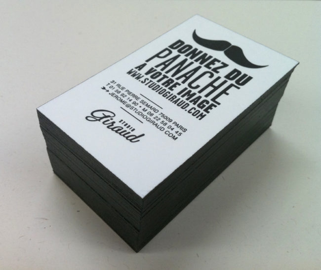 Impression carte de visite 8,5 x 5,5 cm débossage 1 couleurs sur papier 500g, couleur sur tranches. Design par Studio Giraud.