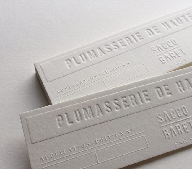 Impression : 1 couleur en débossage + 1 débossage pur recto seul Papier : naturel 500 g Design : Lucie Saint Leu
