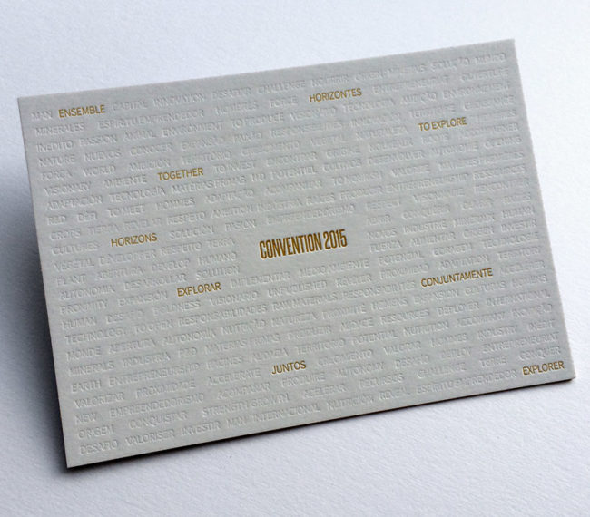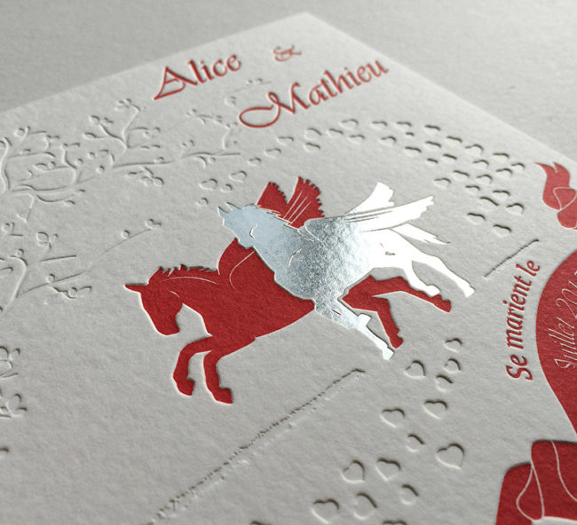 Impression : 1 couleur en débossage + 1 débossage pur + 1 marquage à chaud argent recto seul Papier : naturel 500 g Finition : couleur sur tranches