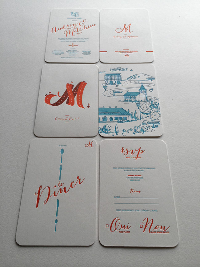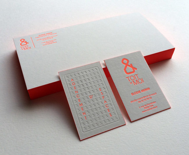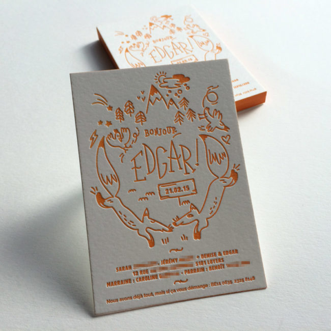 Impression : 1 couleur fluo en débossage + 1 débossage pur recto / verso Papier : blanc 2 x 300 g Finition : couleur sur tranches Design : Aurore Lemaitre