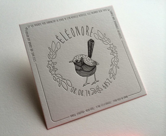 Impression : 1 couleur en débossage recto seul Papier : naturel 500 g Finition : couleur sur tranches Design : Caroline Deroyer