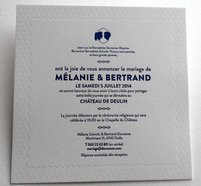 mpression : 1 couleur en débossage + 1 débossage pur recto seul Papier : blanc 2 x 300 g Design : Bertrand Deroanne