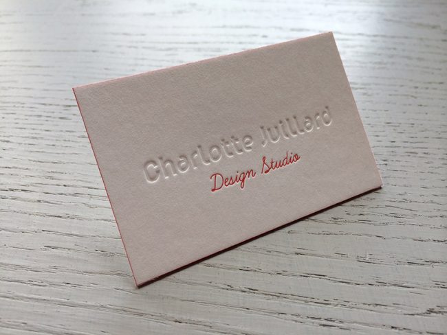 Impression : 1 couleur en débossage + 1 débossage pur recto / verso Papier : blanc 2 x 300 g Finition : couleur sur tranches Design : Charlotte Juillard