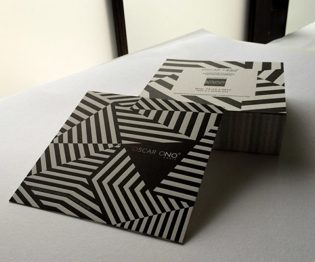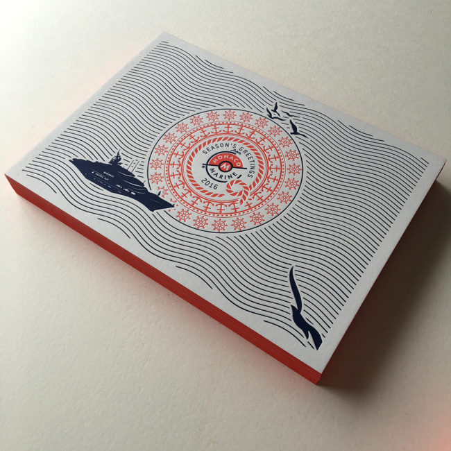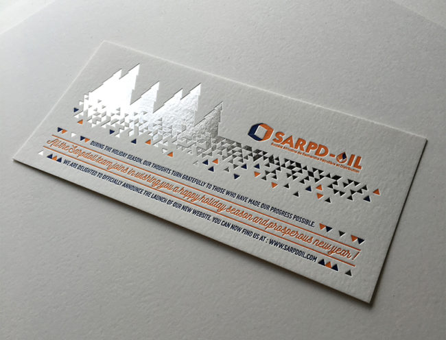 Impression : 2 couleurs en débossage recto/verso Papier : 2 x 300 g Finition : couleur sur tranches