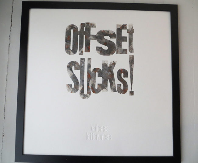 « Même si Digital Printing sucks more… Chaque affiche est unique de par son encrage à l’unité. » Affiche : • impression letterpress, caractères en bois : 1 couleur argent/noir/rouille façon Marble Gully + débossage pur caractères en plomb pour la signature • format 50 x 50 cm • recto seul • papier feutre naturel 500 g