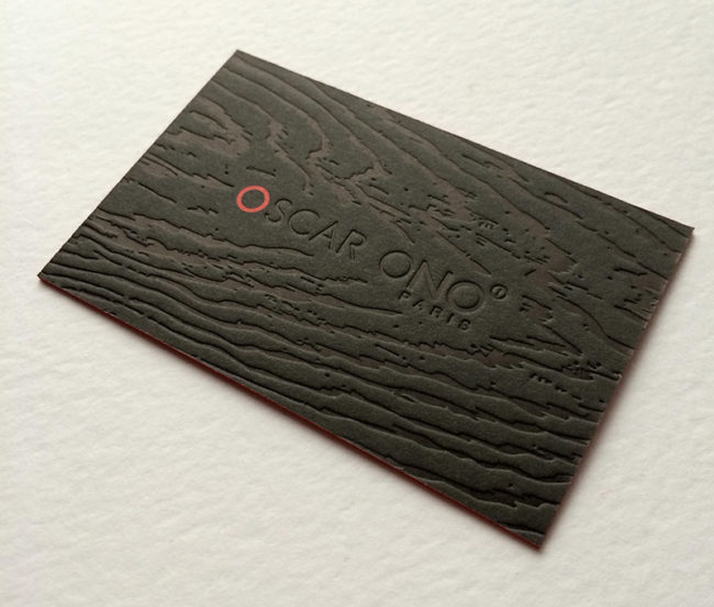 Impression : 1 gaufrage + 1 couleur en débossage recto Papier : 500 g Finition : couleur sur tranches