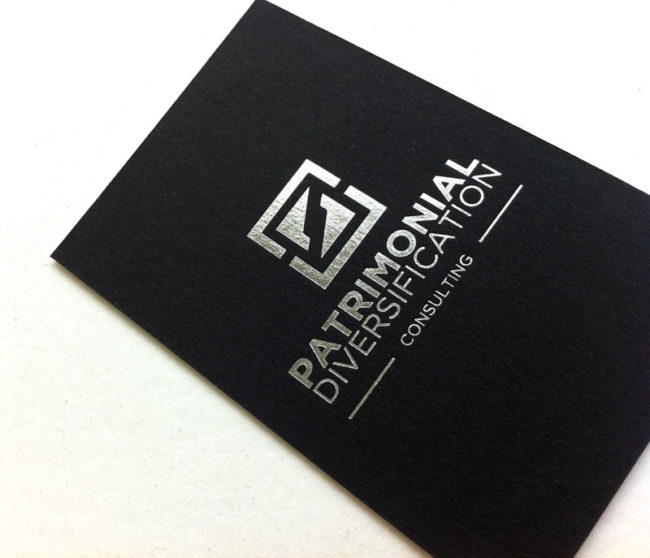 Impression : 1 marquage à chaud argent recto + 1 pantone noir verso Papier : noir 300 g recto + papier blanc 300 g verso