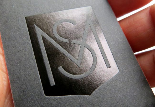 Impression : 1 marquage à chaud recto + 1 couleur en débossage recto/verso Papier : Noir 2 x 300 g Finition : couleur sur tranches argent Design : Marion Riguera