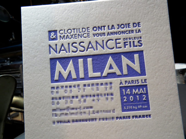 Impression carte de visite 9 x 5 cm, débossage pur et 1 couleur R° sur papier 500g. Design par Takt Design