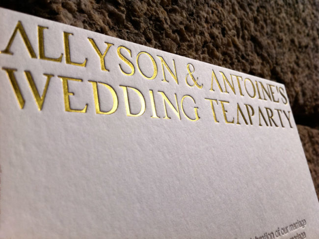Impression faire-part 21 x 15 cm , marquage à chaud or et débossage 1 couleur R° sur papier 500g. Design par InMotherWeTrust