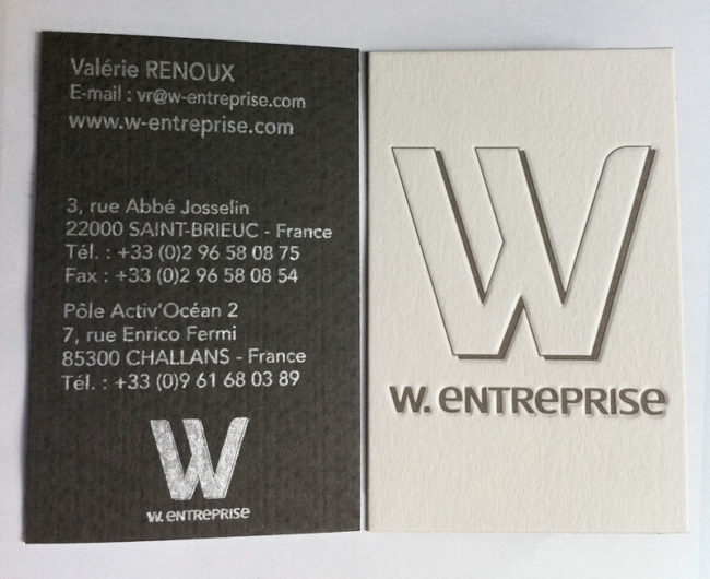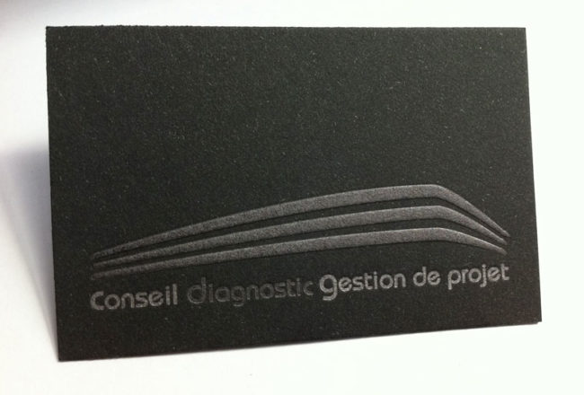 Impression carte de visite 8,5 x 5,5 cm, débossage 1 couleur R°, impression argent V° sur papier duplex blanc 300g / Graphite 300 g.