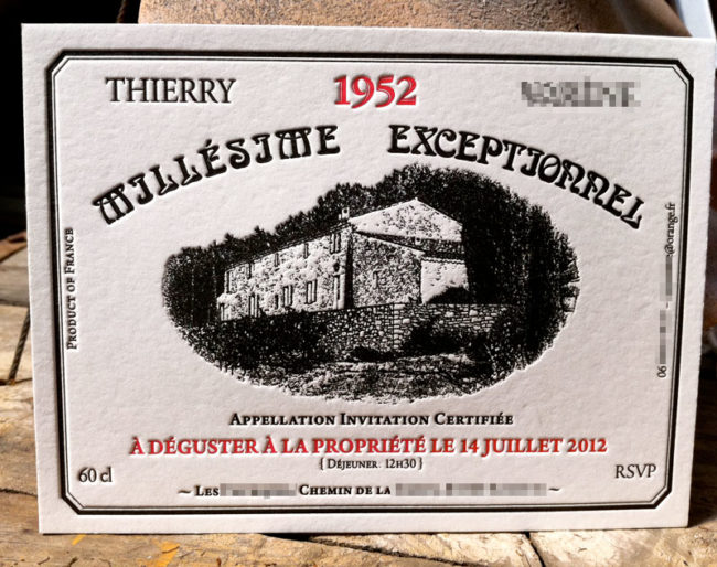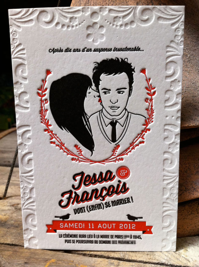 Impression invitation 21 x 15 cm, débossage 2 couleurs sur papier 500g. Design par Thibaut Varene.