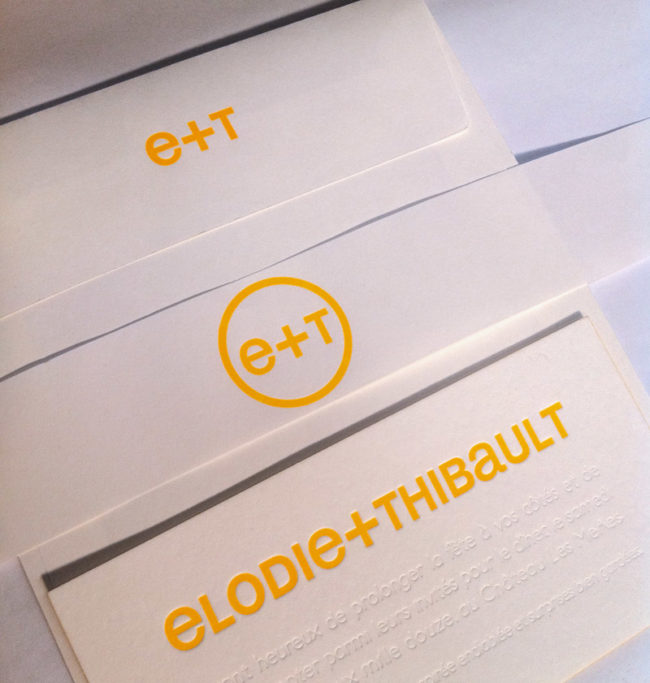Impression faire-part, bandeau, invitation, enveloppe, menu, livret de messe, carte de remerciement, débossage pur et 1 couleur fluo R° + couleur sur tranches sur papier 500g. Design par Elodie Raynal.