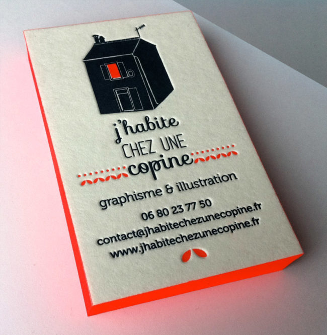 Impression : carte de visite 8,5 x 5,5 cm, débossage 2 couleurs R° Papier : Naturel 500g Finition : couleur sur tranches
