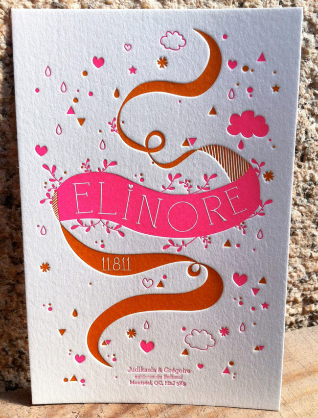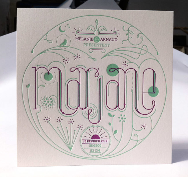 Impression faire-part 15 x 10 cm , débossage 2 couleurs R° sur papier 350g. Design par Emilie Guelpa