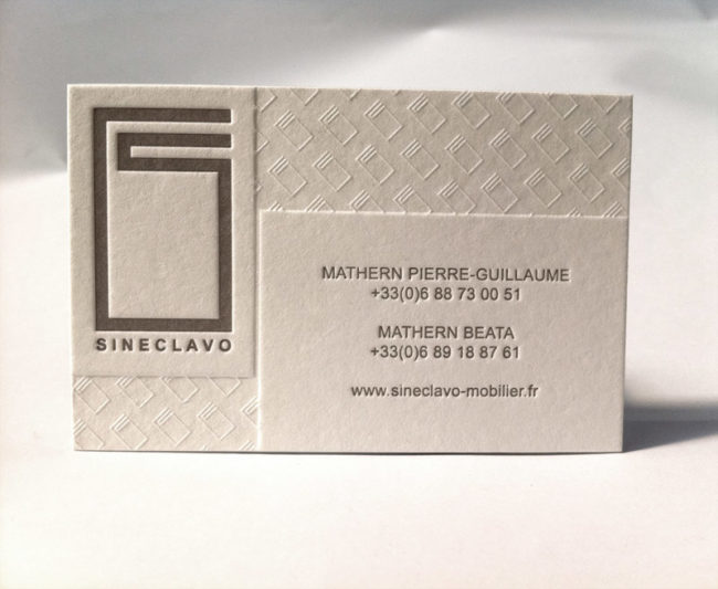 Impression carte de visite 8,5 x 5,5 cm, débossage pur et 1 couleur R° sur papier 500g. Design par Kineka
