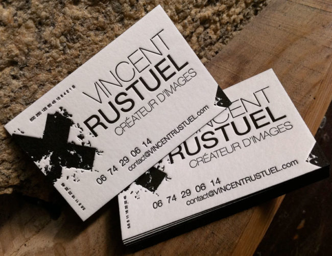 Impression carte de visite 8,5 x 5,5 cm, débossage 1 couleur R° + couleur sur tranches sur papier 500g. Design par Fabien Barral.