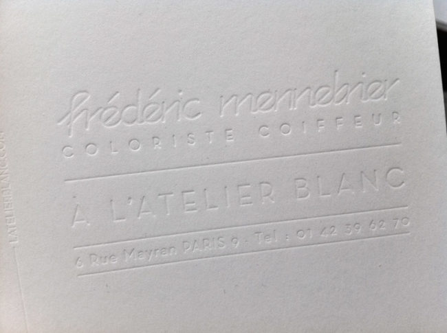 Impression carte de visite 9 x 5 cm, débossage 1 couleur R°/ V° sur papier duplex 300g. Design par Ondine Pannet