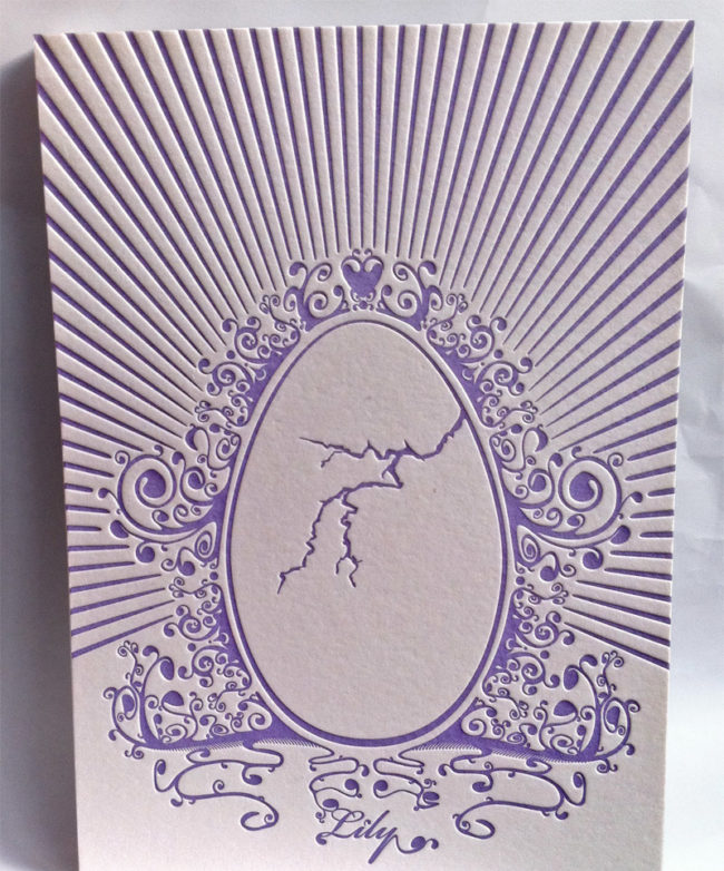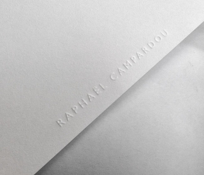 Impression faire-part 21 x 15 cm débossage 1 couleur R° sur papier 500g. Design par Benjamin Delacour