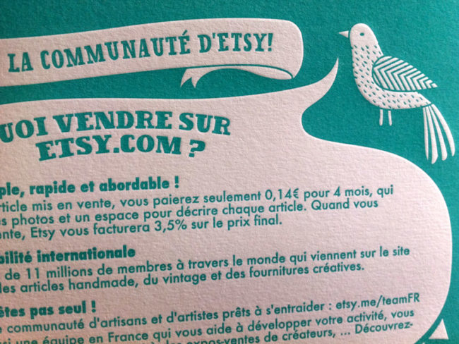 Impression flyer 15 x 10,5 cm, débossage 1 couleur sur papier 300g. Design par Etsy