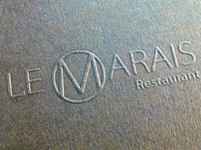 Couverture de menu 23 x 23 cm, gaufrage recto et pose d’oeillets métalliques sur papiers 300 g de couleur contrecollés.