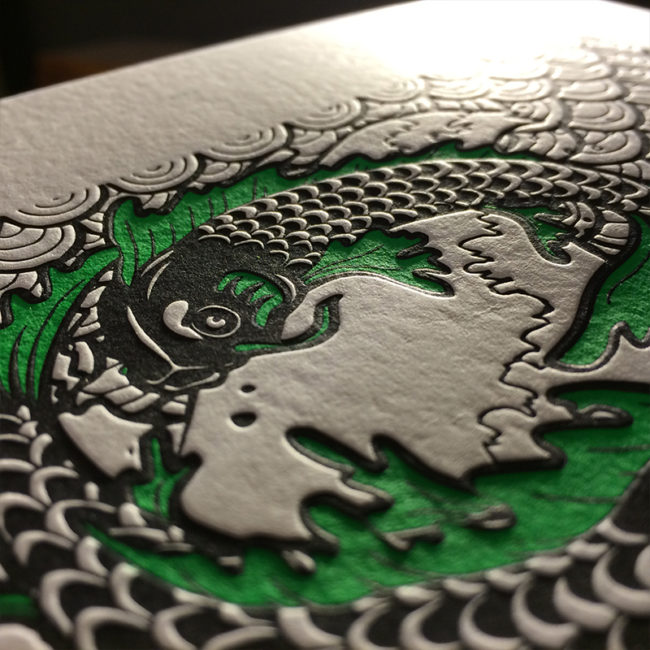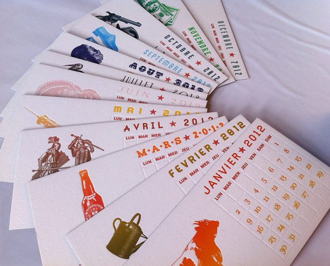Impression calendrier 25 x 25 cm, débossage 2 couleurs + débossage pur R° sur papier 500g. Design par Mindpills