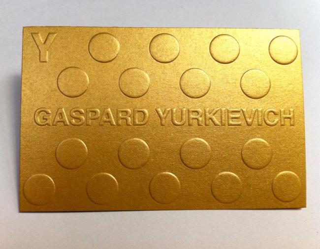 Impression carte de visite 8,5 x 5,5 cm, débossage pur R° et débossage 2 couleurs V° + couleur sur tranches sur papier duplex 2x300g. Design par Tarik Koivisto.