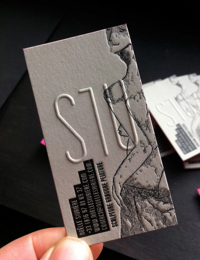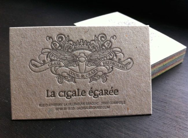 Impression : carte de visite 8,5 x 5,5 cm, débossage 2 couleurs R° Papier contrecollé carton 400g + papier couleur 290g.