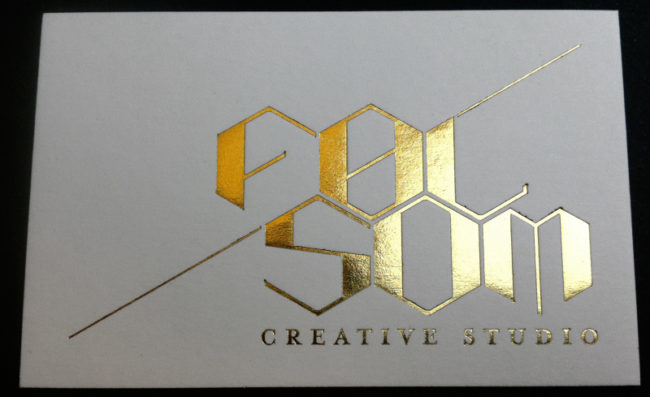 Impression : carte de visite 8,5 x 5,5 cm, marquage à chaud or R° et débossage 1 couleur V° Papier : Duplex 2 x 300g Design par Jany Bassey