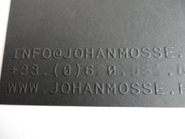 Impression carte de visite 9 x 5 cm, gaufrage R° sur papier duplex 2X300g blanc et noir. Design par Joahn Mossé