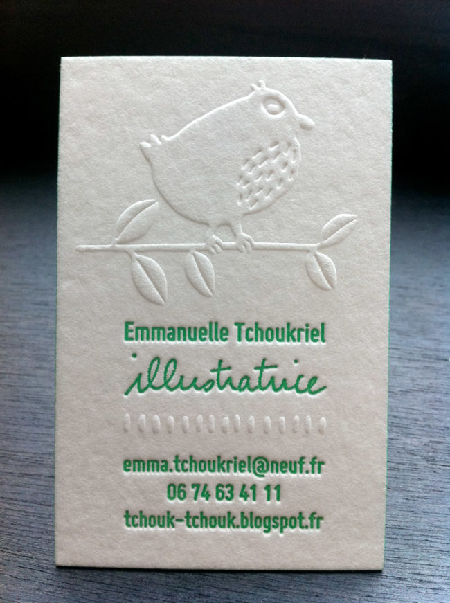 Impression carte de visite 8,5 x 5,5 cm, débossage 1 couleur et gaufrage R° + couleur sur tranches sur papier 500g. Design par Emmanuelle Tchoukriel.