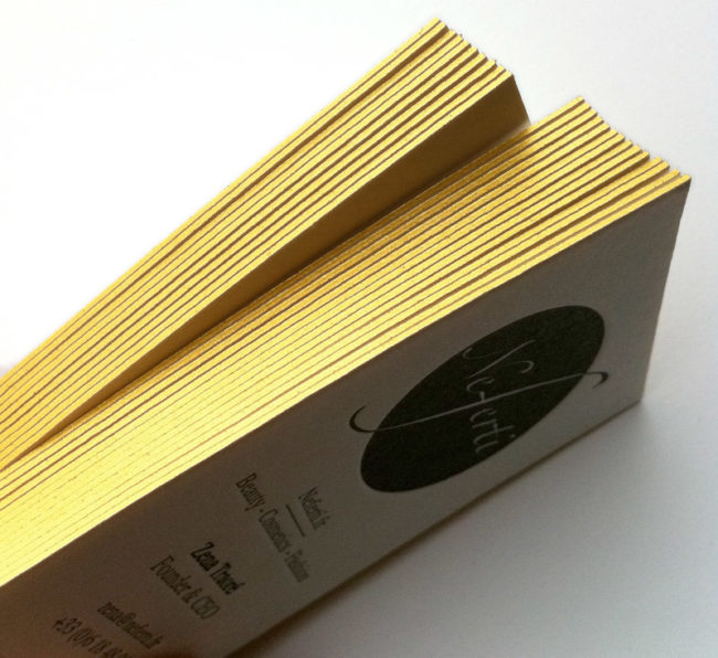 Impression : carte de visite 8,5 x 5,5 cm, débossage 2 couleurs R° Papier : Naturel 500g Finition : couleur sur tranches