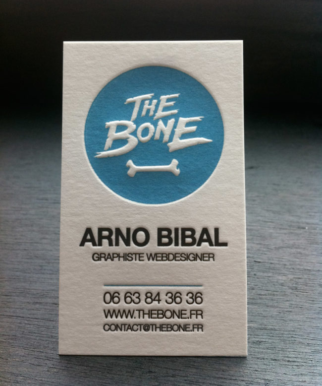 Impression carte de visite 8,5 x 5,5 cm, débossage 2 couleurs R° sur papier 500g. Design par Arno Bibal.