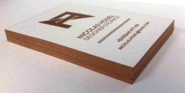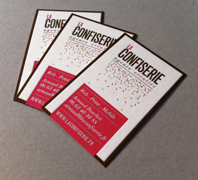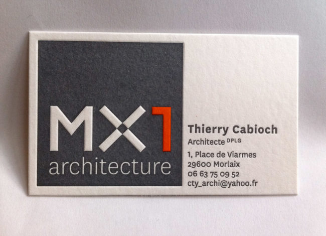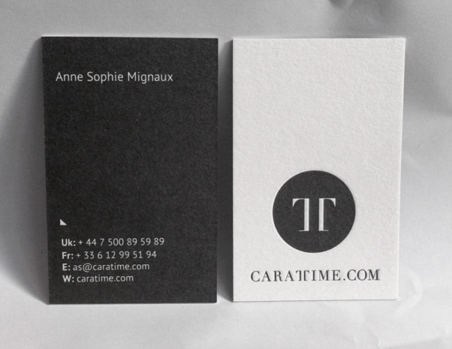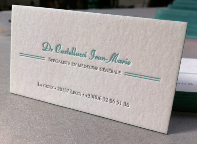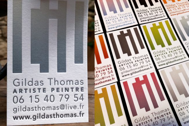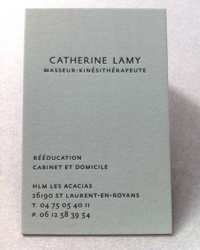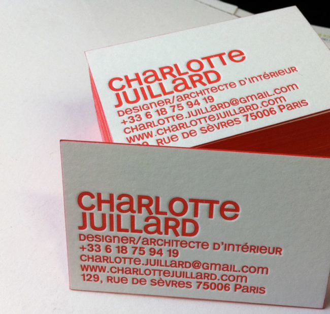Impression carte de visite 8,5 x 5,5 cm, débossage 1 couleur R° + couleur sur tranches sur papier 500g. Design par Charlotte Juillard