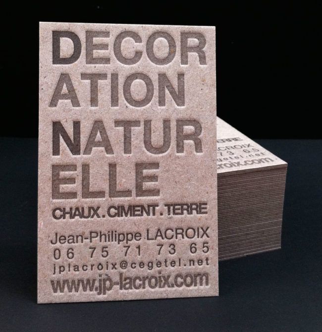 Impression carte de visite 8,5 x 5,5 cm, débossage 2 couleurs R° sur carton 500g. Design par Jean-Philippe Lacroix.
