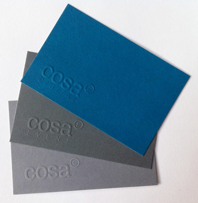 Impression carte de visite 8,5 x 5,5 cm, gaufrage et impression 1 couleur R° + 2 couleurs V° sur papier 350g. Design par Cosa.