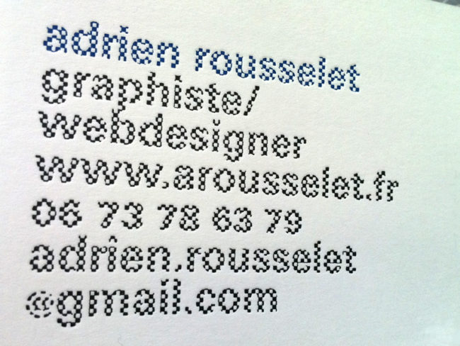 mpression carte de visite 8,5 x 5,5 cm 3 couleurs ( 2 couleurs recto / 2 couleurs verso ) sur papier 350g. Design par Adrien Rousselet.