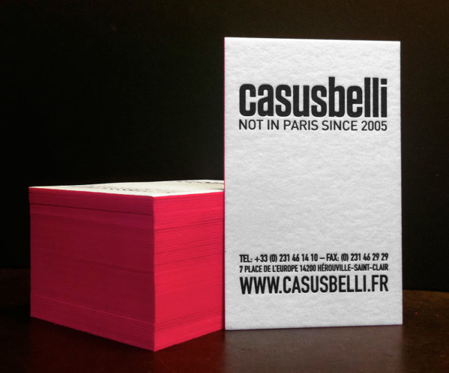 Impression carte de visite 8,5 x 5,5 cm et carte de correspondance 21 x 10 cm 1 couleur R° + couleur sur tranches sur papier 500g. Design par Casusbelli.