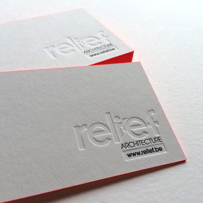 Impression carte de visite : 1 gaufrage + 1 couleur en débossage recto/ 1 couleur verso Papier : 350 g Impression carte de correspondance : 1 gaufrage + 1 couleur en débossage recto seul Papier : 350 g Impression pochette : 1 couleur en débossage recto seul Papier : 350 g Design : Agence Tigre…