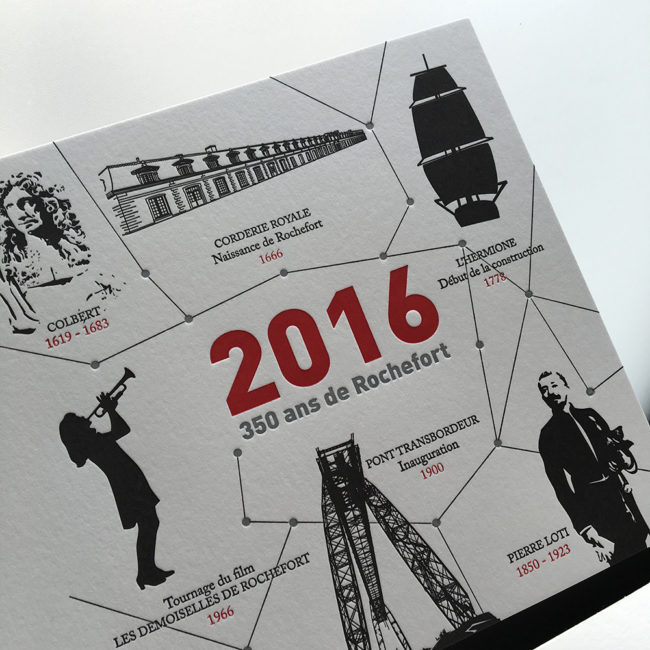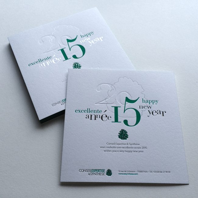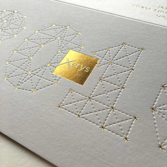 Impression : 2 couleurs en débossage + 1 débossage pur + 1 marquage à chaud argent recto seul Papier : Blanc 500 g Finition : couleur sur tranches Design : Ipso Facto