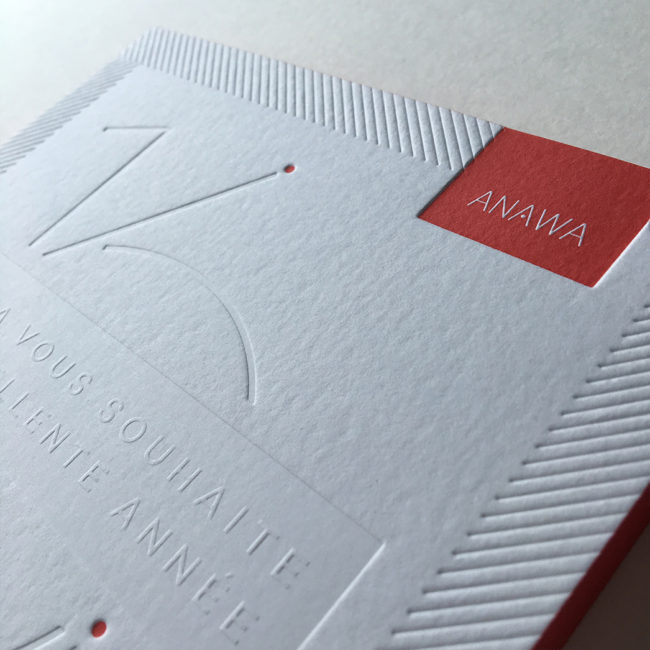Impression : 1 gaufrage + 1 couleur en débossage recto Papier : 500 g Finition : couleur sur tranches