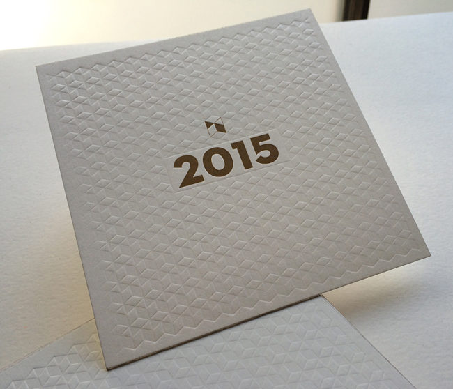Impression : 1 couleur en débossage + 1 marquage à chaud recto seul Papier : blanc 500 g Design : Atelier Lum