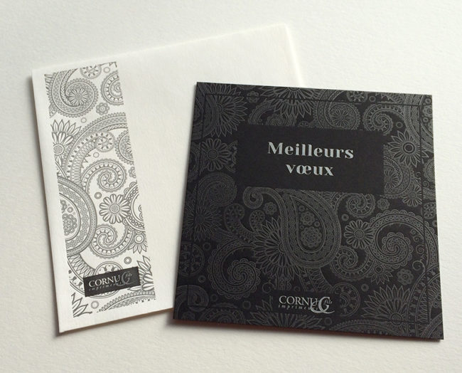 Impression : 2 pantones argent et argent/noir métallisés en débossage recto seul Papier : noir 360 g + enveloppes Design : Imprimerie Cornu