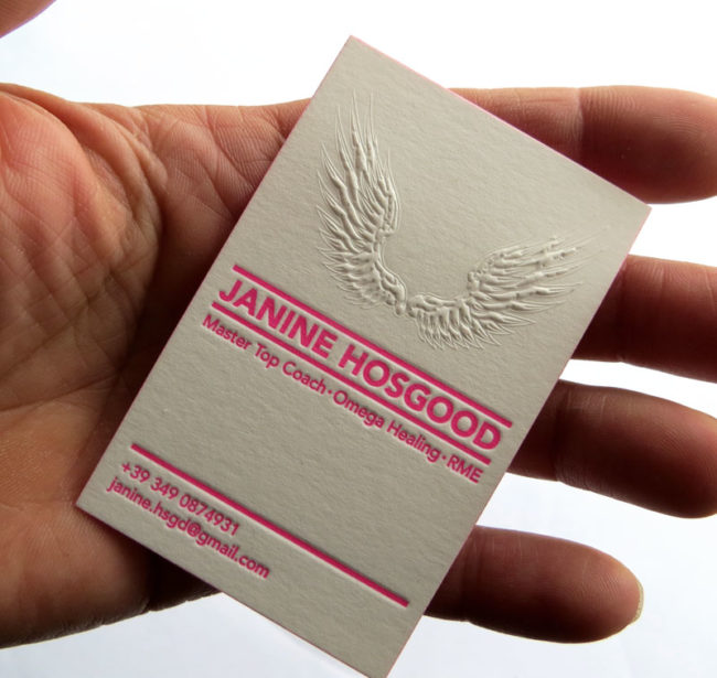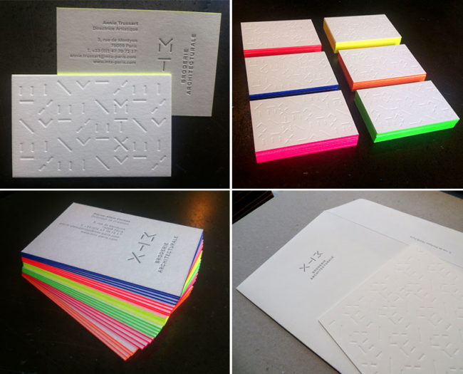Débossage 1 couleur et débossage pur R°/V° + couleur sur tranches fluo sur papier 2x300g. Carte de visite, carte de correspondance, tête de lettre, enveloppe. Design par Studio Apeloig.