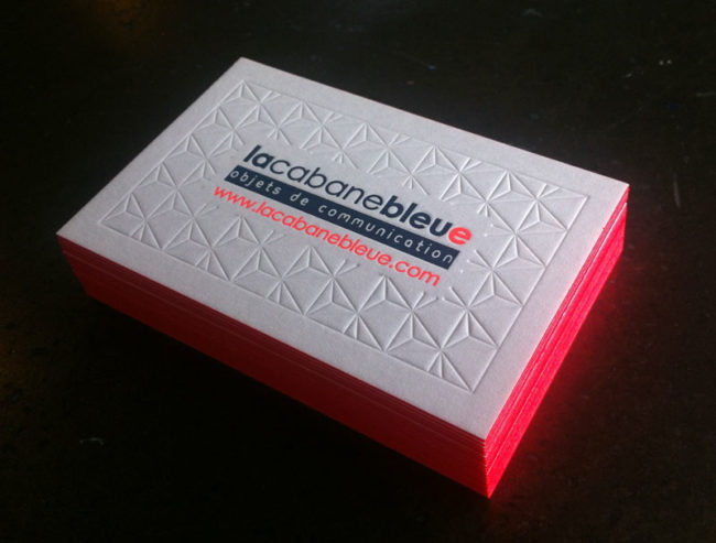 Débossage 2 couleurs et débossage pur R°/V° + couleur sur tranches fluo sur papier 2x300g. Design par La Cabane Bleue.