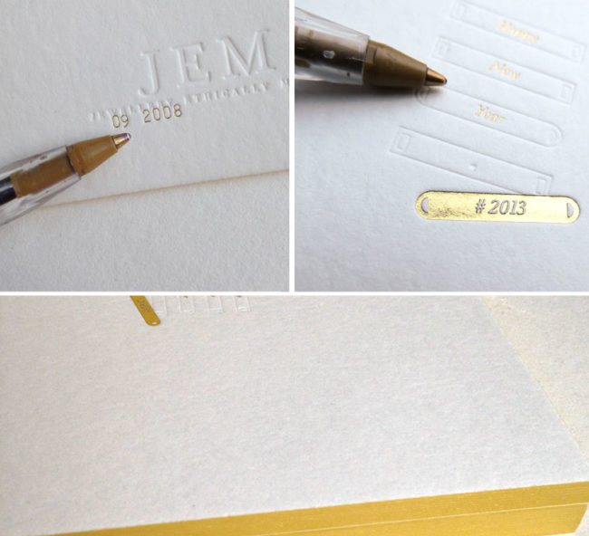 Débossage pur et marquage à chaud or R° + tranches couleur sur papier 500g. Design par Jem.