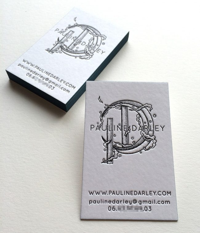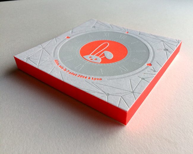 Impression : 1 couleur en débossage recto seul Papier : blanc 500 g Finition : couleur sur tranches Design : Pauline Darley
