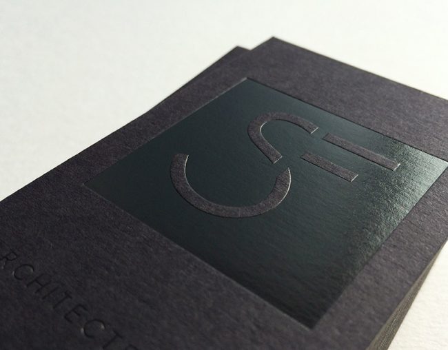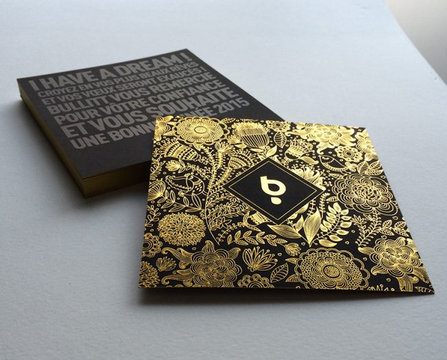 Impression : 1 marquage à chaud or recto / 1 marquage à chaud noir verso Papier : noir 2 x 300 g Finition : couleur sur tranches Design : Bullit