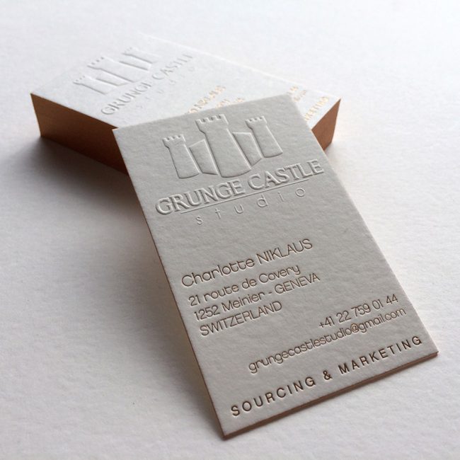 Impression : 1 marquage à chaud cuivre + 1 gaufrage recto seul Papier : naturel 500 g Finition : couleur sur tranches