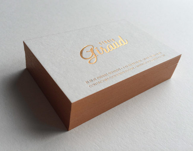 Impression : 1 marquage à chaud cuivre recto seul Papier : naturel 500 g Finition : couleur sur tranches Design : Studio Giraud